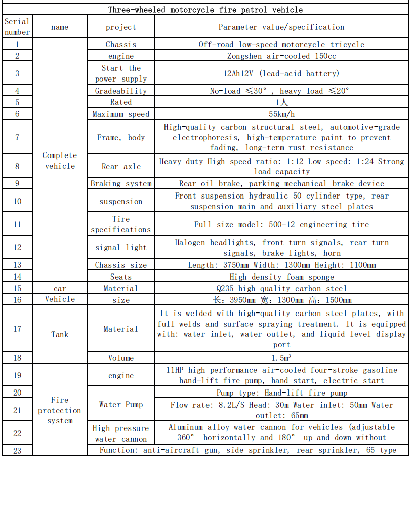 Memandangkan gred rendah jalan luar bandar dan jarak jauh dari stesen api, motosikal api tiga roda boleh digunakan sebagai peralatan utama briged api profesional perbandaran. Mereka boleh membawa lebih banyak bekalan daripada kenderaan beroda dua dan lebih mudah disesuaikan dengan keadaan jalan yang kompleks daripada trak api empat roda, menyedari "penghantaran polis berdekatan dan pelupusan yang cepat."